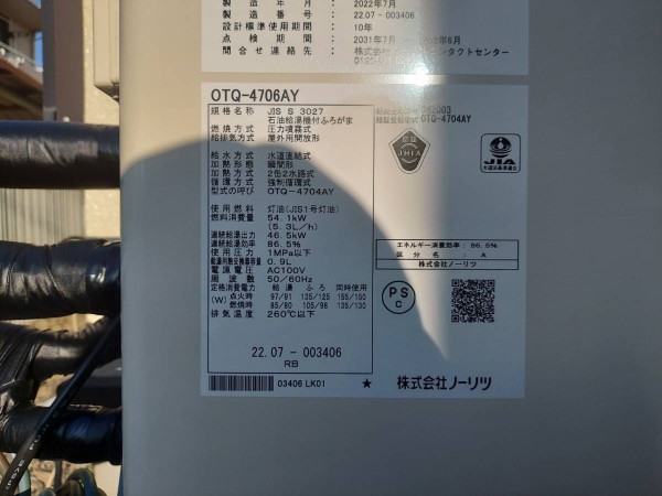 美祢市 ノーリツOTQ-4701AY→ノーリツ石油給湯機付ふろがまOTQ-4706AY 給湯器交換工事