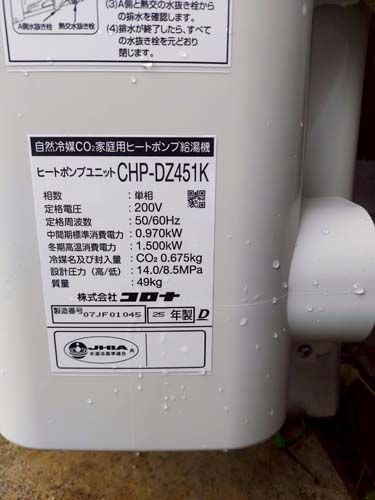 周南市栄町 コロナ自然冷媒CO2家庭用ヒートポンプ給湯機 ヒートポンプユニットCHP-DZ451K エコキュート交換工事