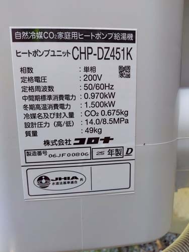 宇部市駅前 コロナ自然冷媒CO2家庭用ヒートポンプ給湯機 ヒートポンプユニットCHP-DZ451K エコキュート交換工事