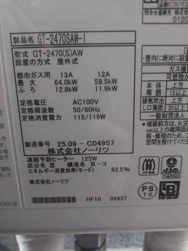 宇部市松崎町 ノーリツ給湯器GT-2470SAW-1 給湯器交換工事
